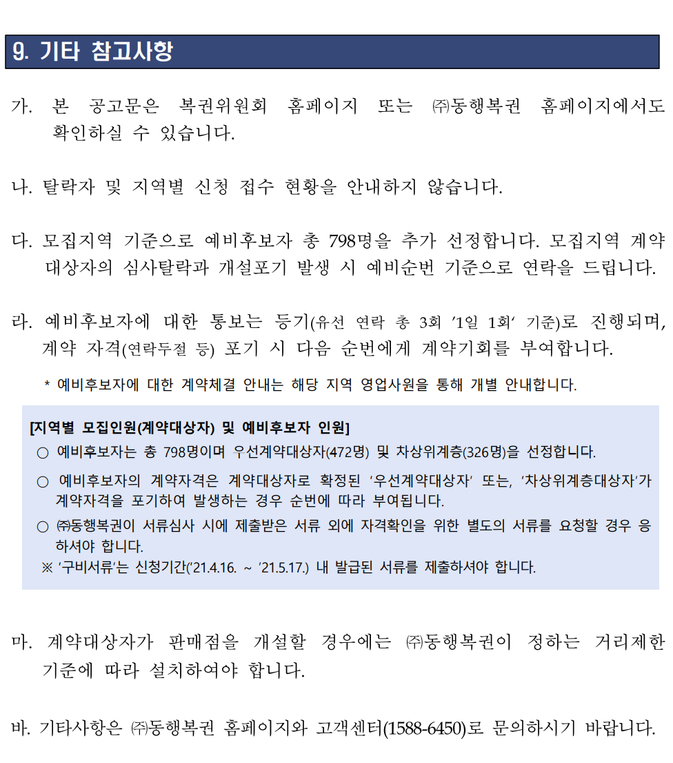 다. 계약대상자 선정 발표 방법 : ㈜동행복권 홈페이지 내「판매인 모집공고」에 게시 및 문자(SMS) 발송과 우편물 수령 기재 주소로 등기 발