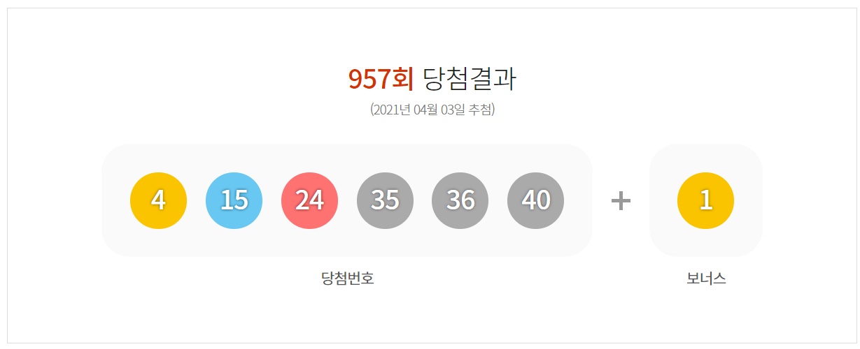 957회 로또 추첨번호는 4,15,24,35,36,40 입니다. 보너스 번호는 1입니다.