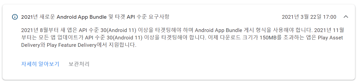 2021년 8월 부터 앱 업로드시 API 30이상으로 타켓팅해야하며, Android App Bundle를 적용해야합니다. APK는 이제 업로드 불가!!!