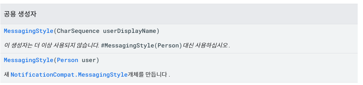 처음 보는 메소드가 보여 찾아보았다. NotificationCompat.MessagingStyle 너는 무엇을 하는 함수이더냐!!? 샘플코드를 보아서는 대화형의 메세지를 주고받을 때 사용되는 것으로 보여진다. 구글번역기의 도움으로 살펴보았다.