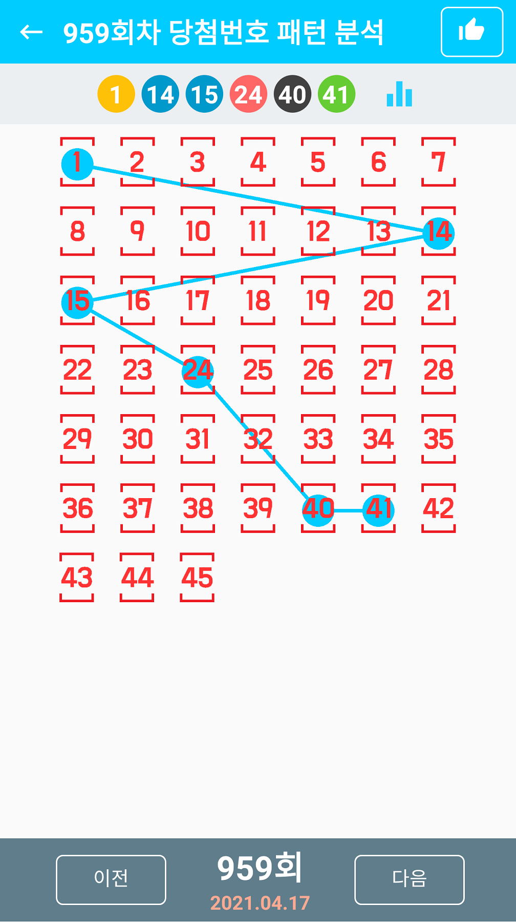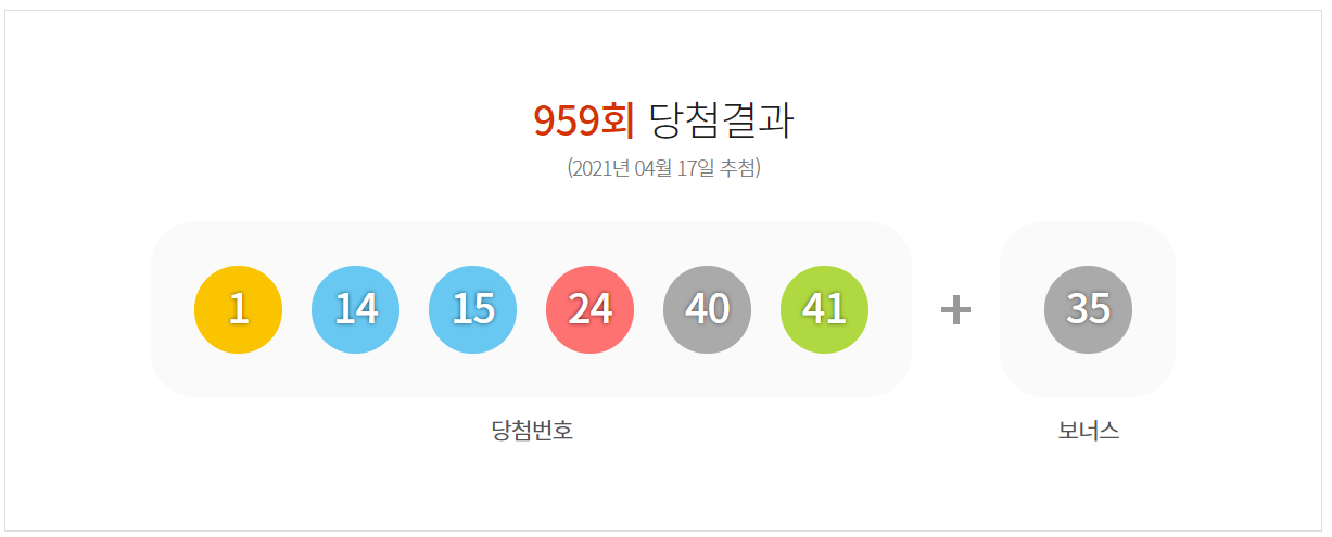 959회 로또 추첨번호는 1,14,15,24,40,41 입니다. 보너스 번호는 35입니다.