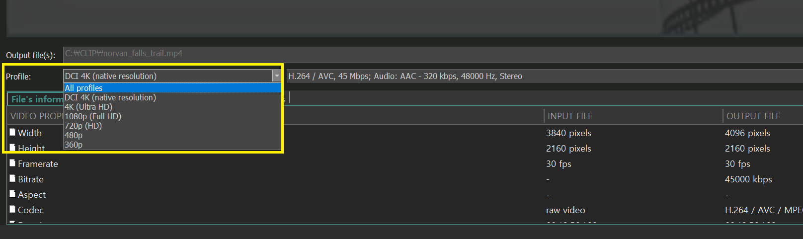 4. 제일 중요한 Profile 설정 부분입니다. 유튜브용으로 선택했음으로 필요한 프로파일 옵션만 나타납니다. 이때 4K 관련 프로파일이 2개가 나나탑니다. DCI 4K(native resoulution)과 4K (Ultra HD) 메뉴중에 어떤 것을 선택해야할지 모르겠지요? 우리가 촬영한 영상을 먼저 확인해서 해상도를 확인해야합니다. 확인 방법은 다음과 같습니다.