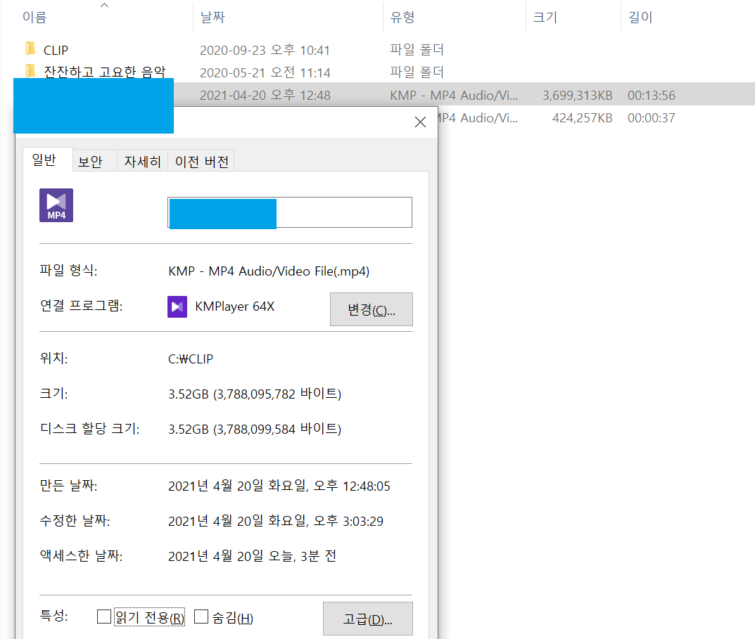 11. 완성된 파일의 용량을 확인해보았습니다. 14분 영상의 용량은 3.52기가 정도 됩니다.