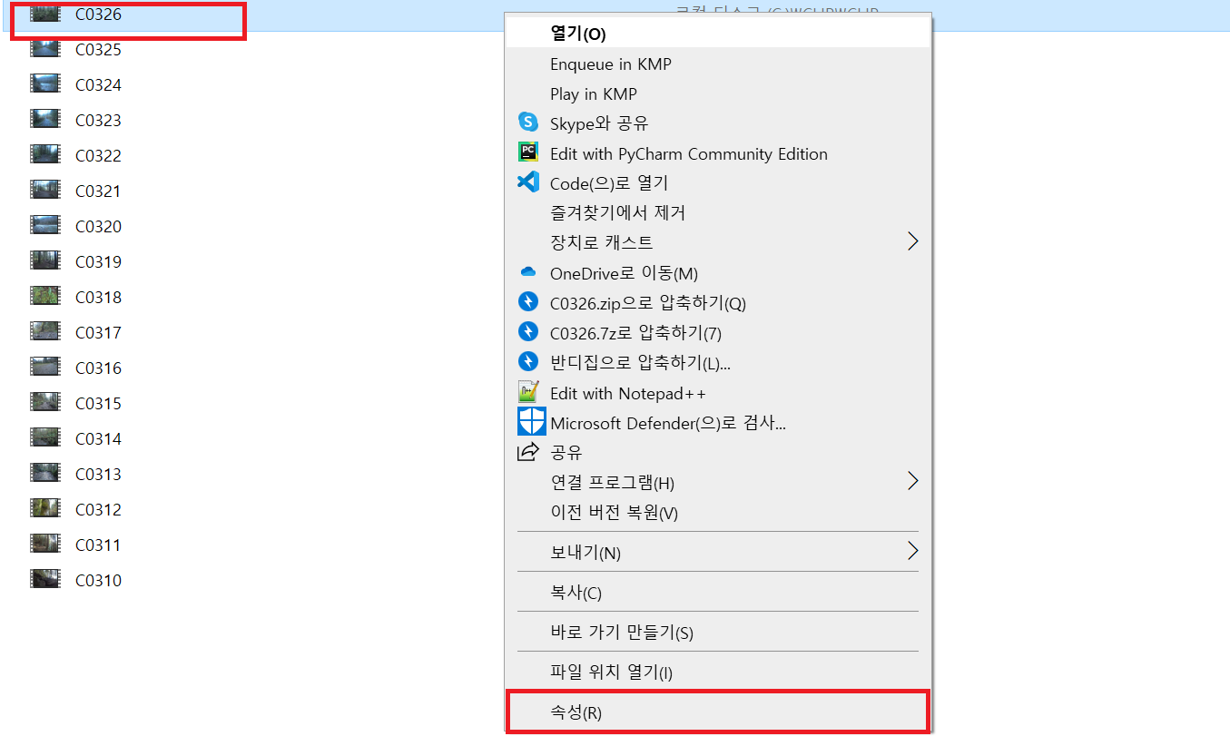 파일을 선택 후 마우스 오른쪽버튼을 누르면 팝업메뉴가 나타납니다. 이때 속성(R)을 선택하세요.