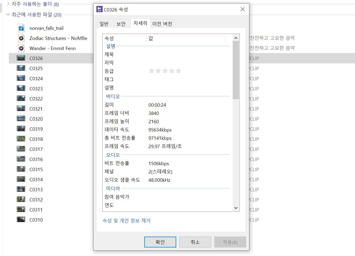 그런 다음 자세히 탭을 클릭하시면 비디오 영상의 프레임 너비와 높이값이 나옵니다. 너비가 3840이고 높이가 2160인 비디오는 4K(UHD)영상임을 의미합니다.