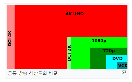 | 4K (Ultra HD) | 3,840 x 2,160 | 초고해상도 텔레비전 Ultra High Definition Television |