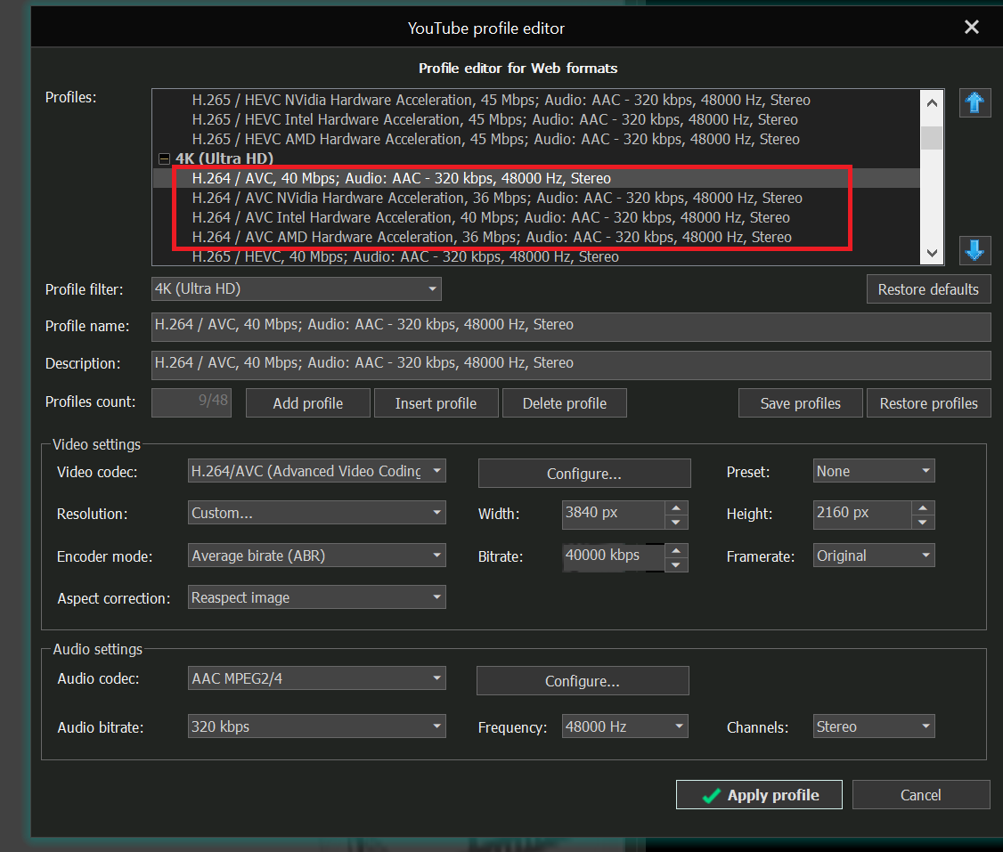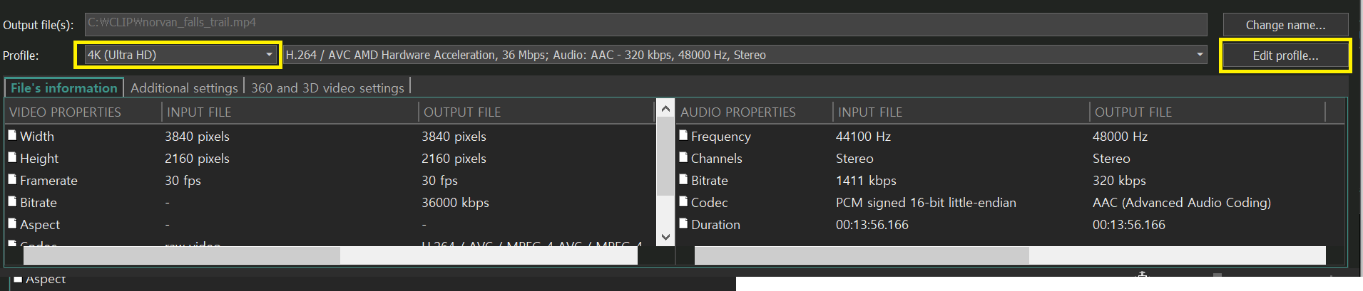 5. 해상도 확인을 완료했어요. 4K(Ultra HD)를 선택한 다음 Edit profile…를 선택합니다.