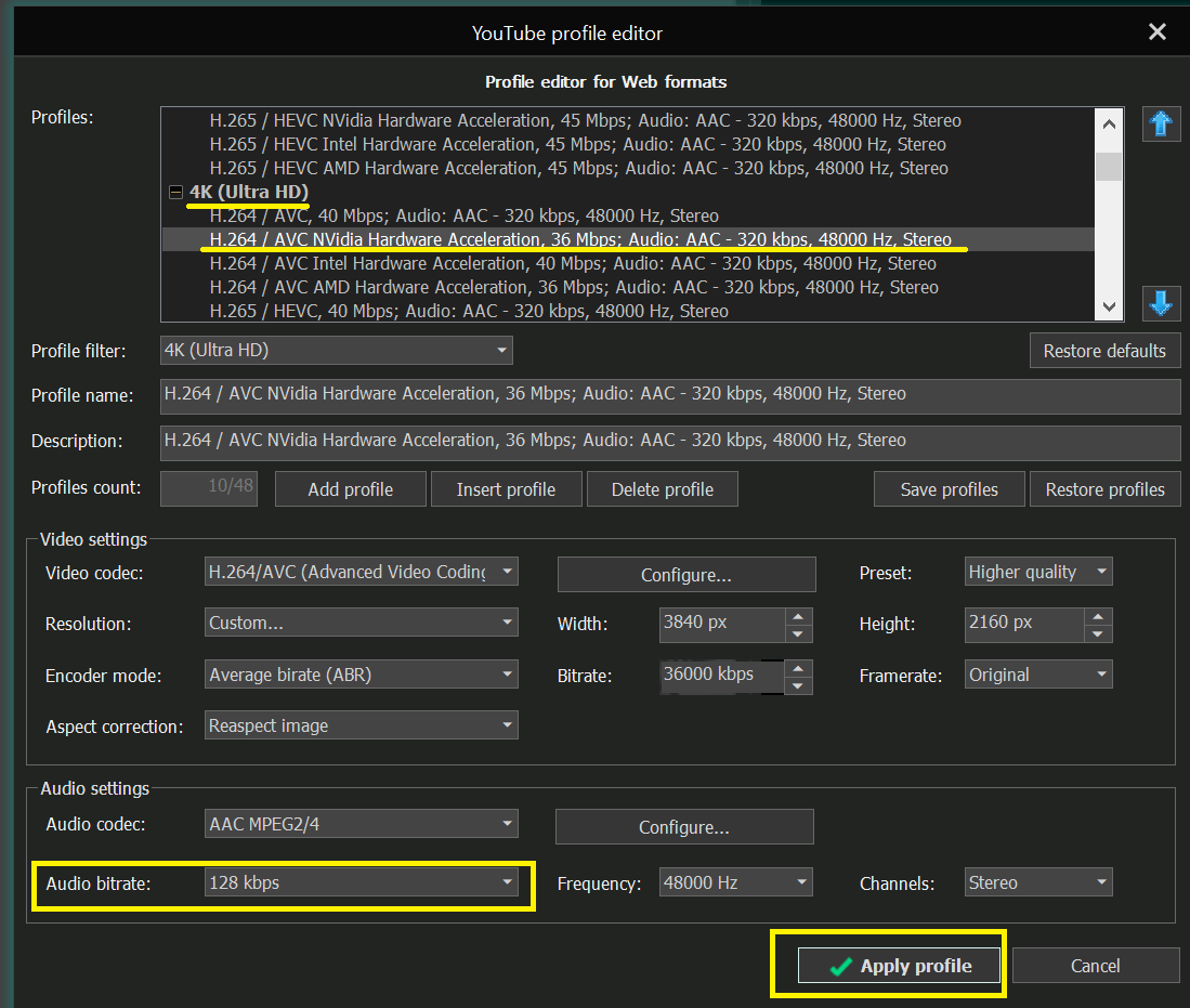 7. 오디오 설정에서 저는 128로 변경했어요. 320kbps로 둬도 무방합니다. Apply profile 버튼을 클릭합니다.