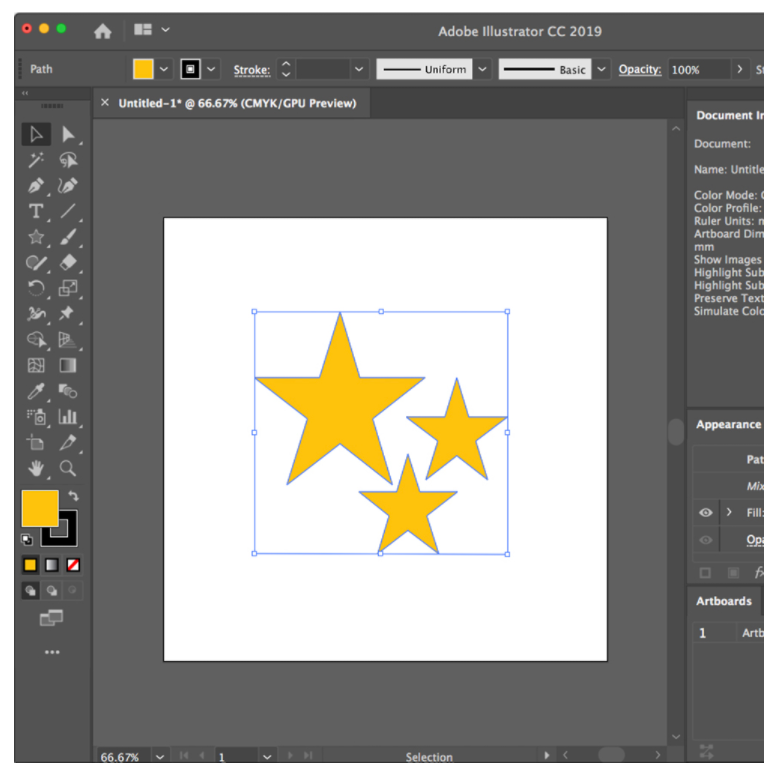 EPS 파일은 4 MP 이상, 25 MP 이하여야 합니다. EPS 파일의 경우 이러한 요건은 작품의 아트보드가 아닌 테두리 상자에 해당됩니다. 아래의 예시에서 아트보드는 노란색 별 뒤에 위치한 하얀색 사각형입니다. 테두리 상자는 자동으로 생성되어 실제 작품을 둘러싸고 있는 파란색 상자입니다.