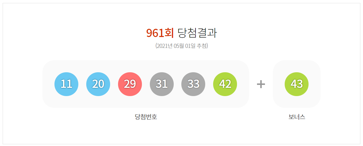 당첨번호는 11,20,29,31,33,42 입니다. 보너스 번호는 43입니다.