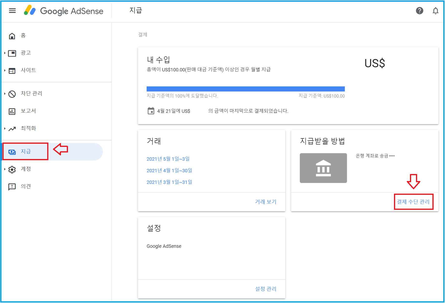 3. 지급받을 방법 > “결제 수단 관리“를 클릭합니다.