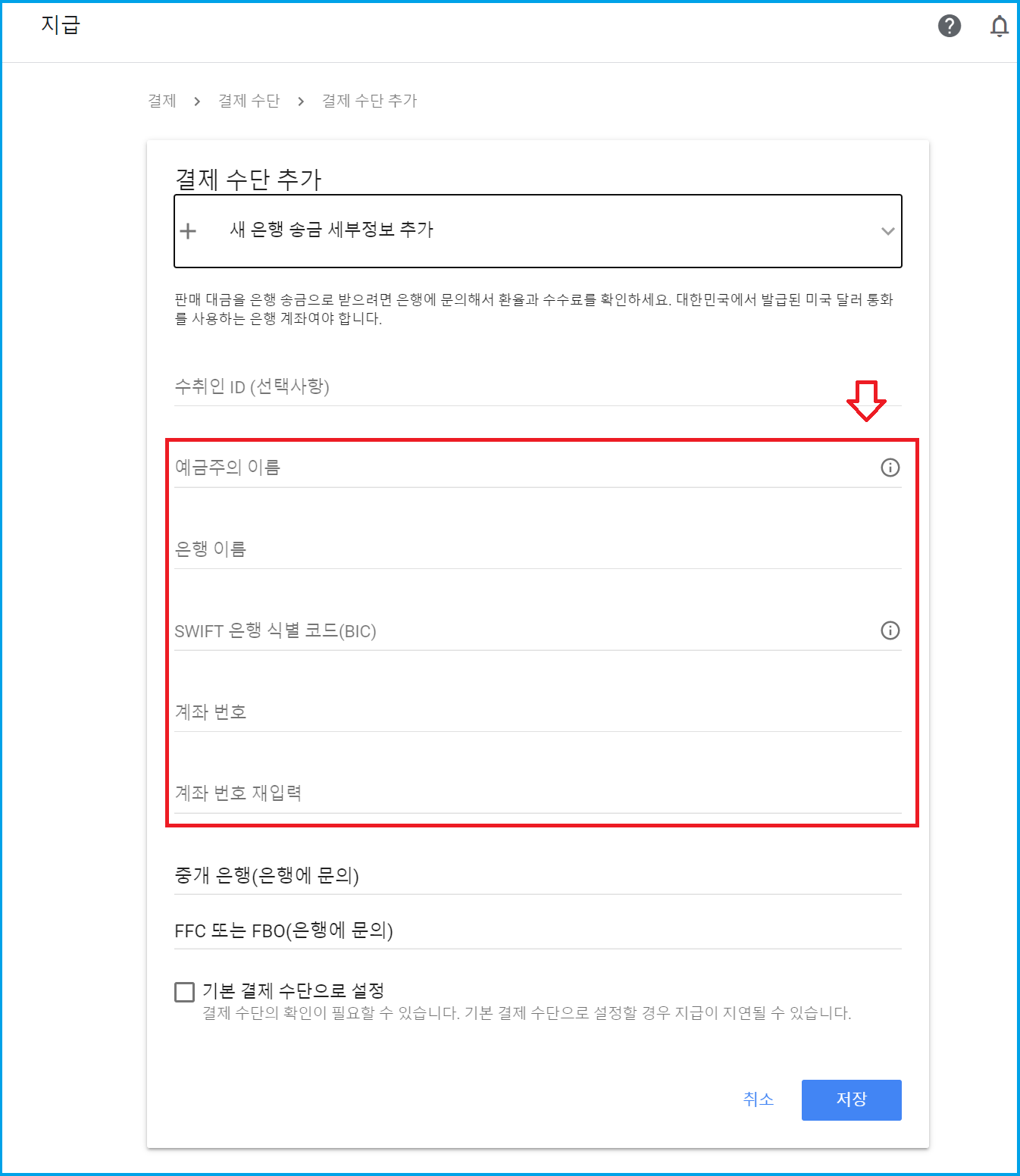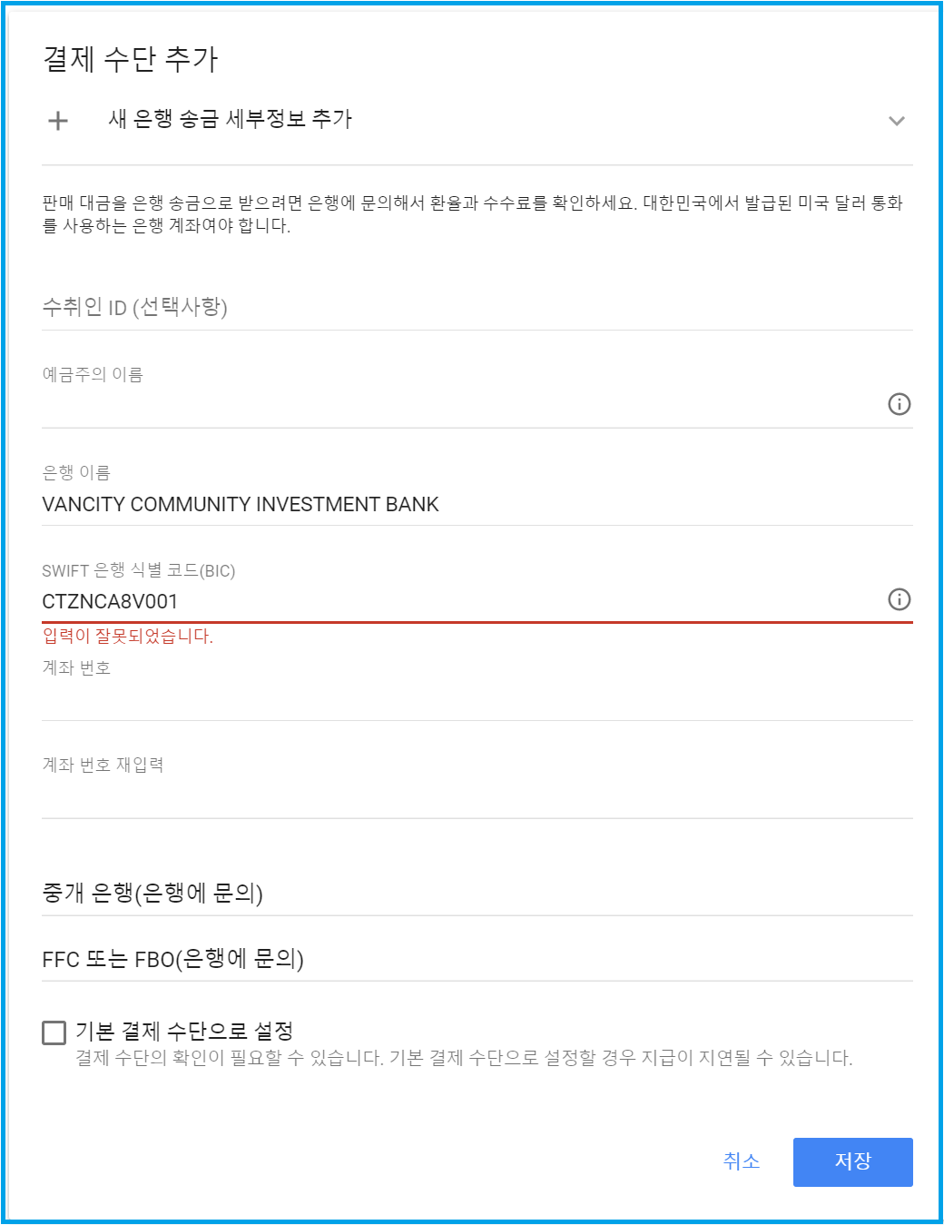 6. 예금주의 이름, 은행 이름, SWIFT 은행 식별코드(BIC), 계좌번호 등 4가지 항목만 정확하게 등록해줍니다. 수취인ID(선택사항)은 입력하지 않아도 됩니다. 예금주의 이름은 영문으로 입력합니다. 지급 결제 은행으로 등록할 대상 은행의 정보와 일치시키면 됩니다. 계좌 번호 재입력 까지 입력 후 저장 버튼을 클릭하면 마무리 됩니다.