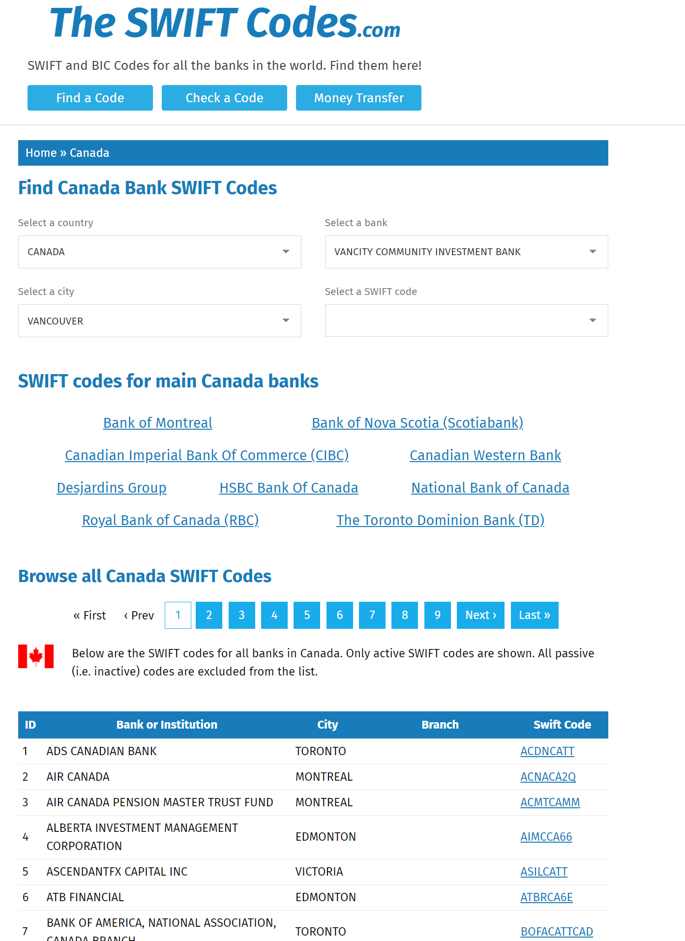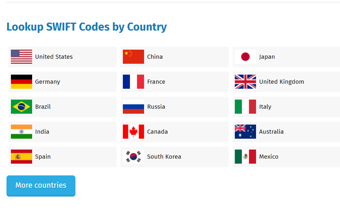 스위프트 은행 식별코드(BIC)는 www.theswiftcodes.com/ 사이트에서 찾을 수 있습니다. 이 사이트외에도 몇 개의 사이트가 더 있으나 가장 편한 검색UI를 제공합니다. 이 사이트에 방문 후 찾을 대상의 나라를 선택합니다.