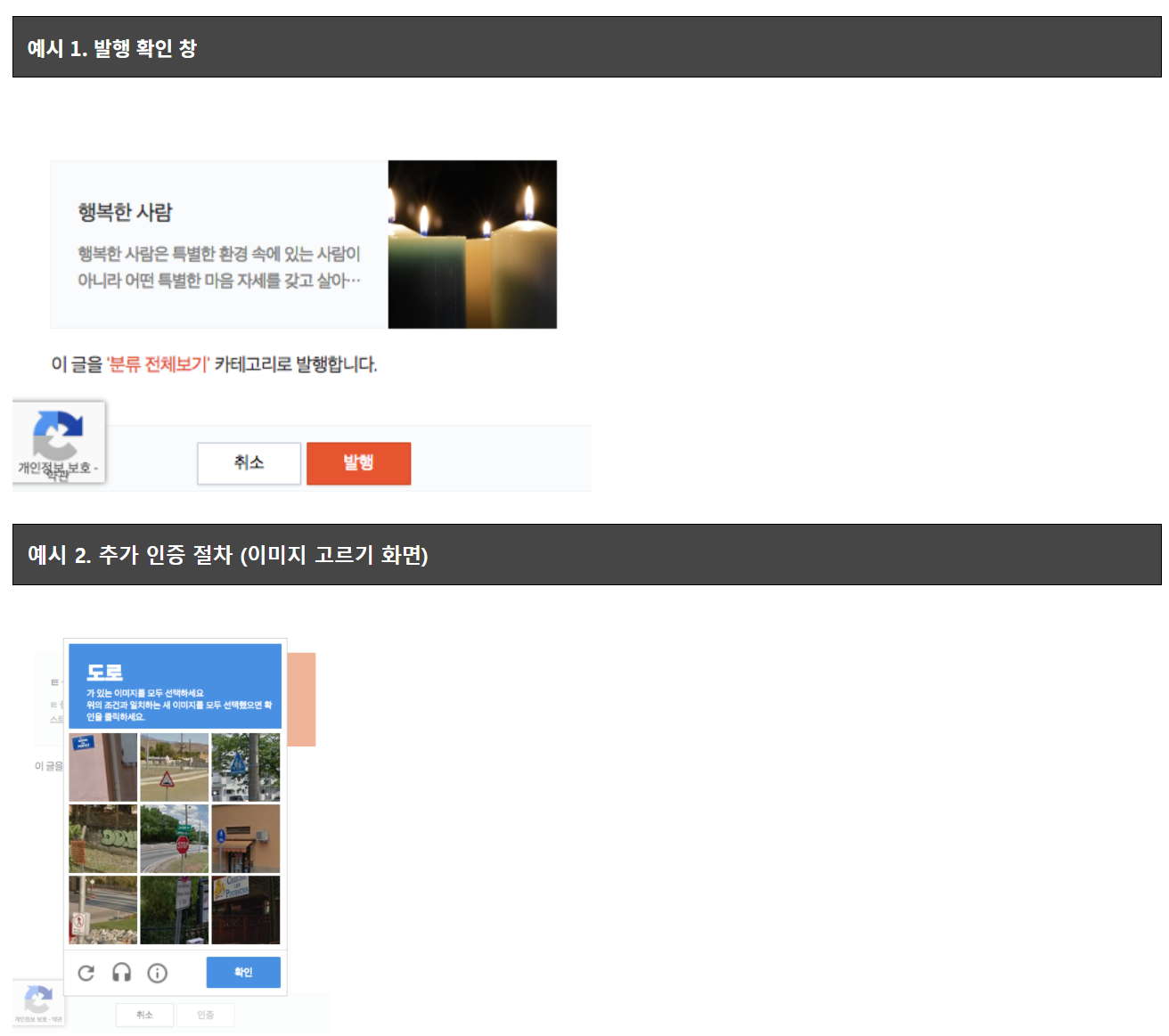사람이 아닌 봇이 글을 저장/발행/수정하는 것을 방지하는 장치입니다. 대부분의 경우는 발행 확인창을 만나게 되고, 일부는 추가적인 인증절차(이미지 고르기 화면)를 거치게 됩니다. 맨 아래 예시화면을 참고해 주세요.