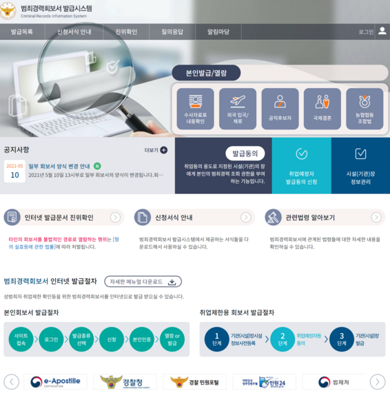 범죄 수사경력 회보서를 인터넷으로 발급 받을 수 있습니다.