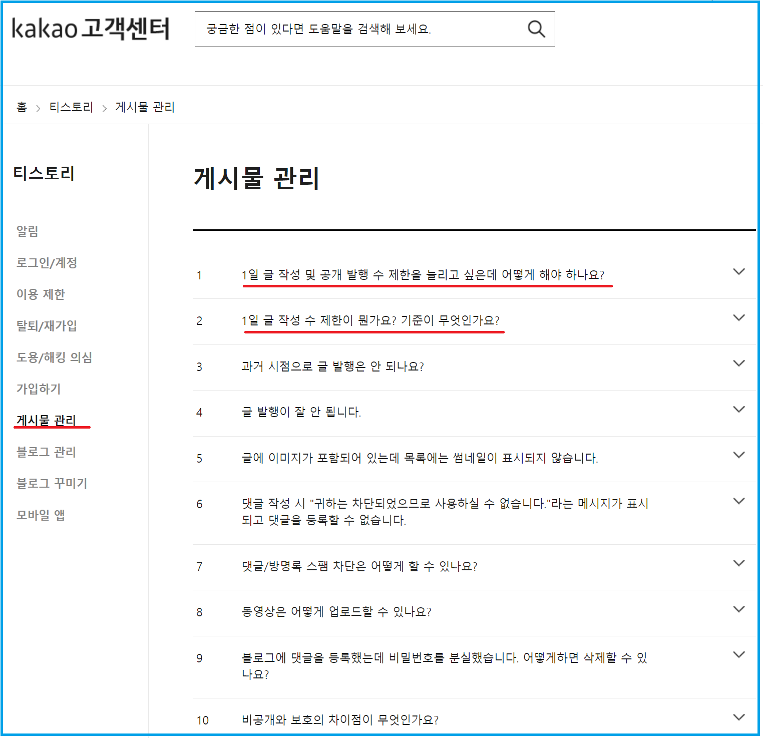 좀 더 정확한 정책을 알아보기 위해 kakao 고객센터의 게시물 관리 메뉴를 찾았습니다.