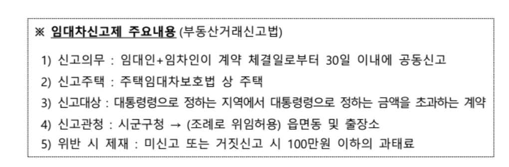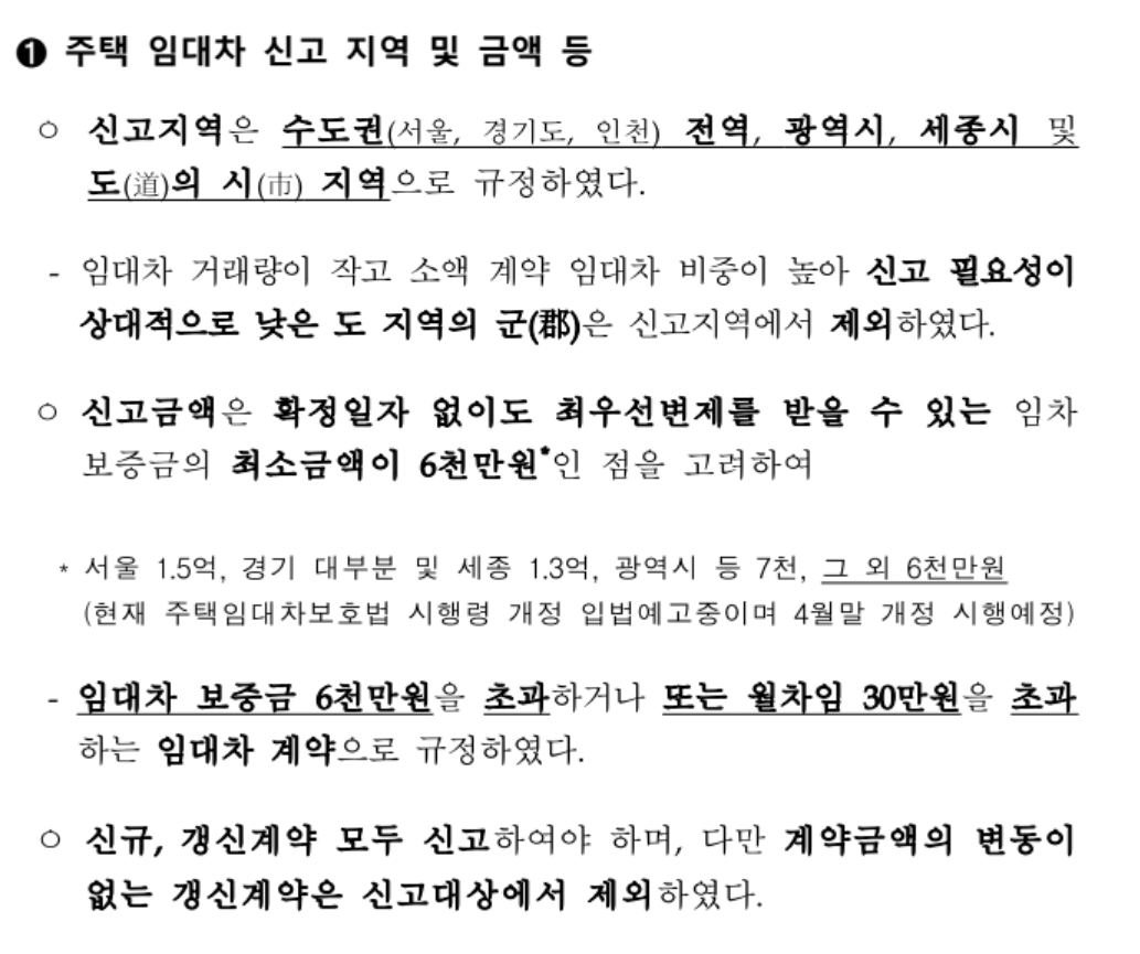 전세보증금이 6,000만원을 초과하거나 월세가 30만원을 초과하는 경우 반드시 계약 내용을 신고해야합니다. 6월부터 새로운 임대차계약을 맺거나 갱신할 때 신고하면 됩니다.