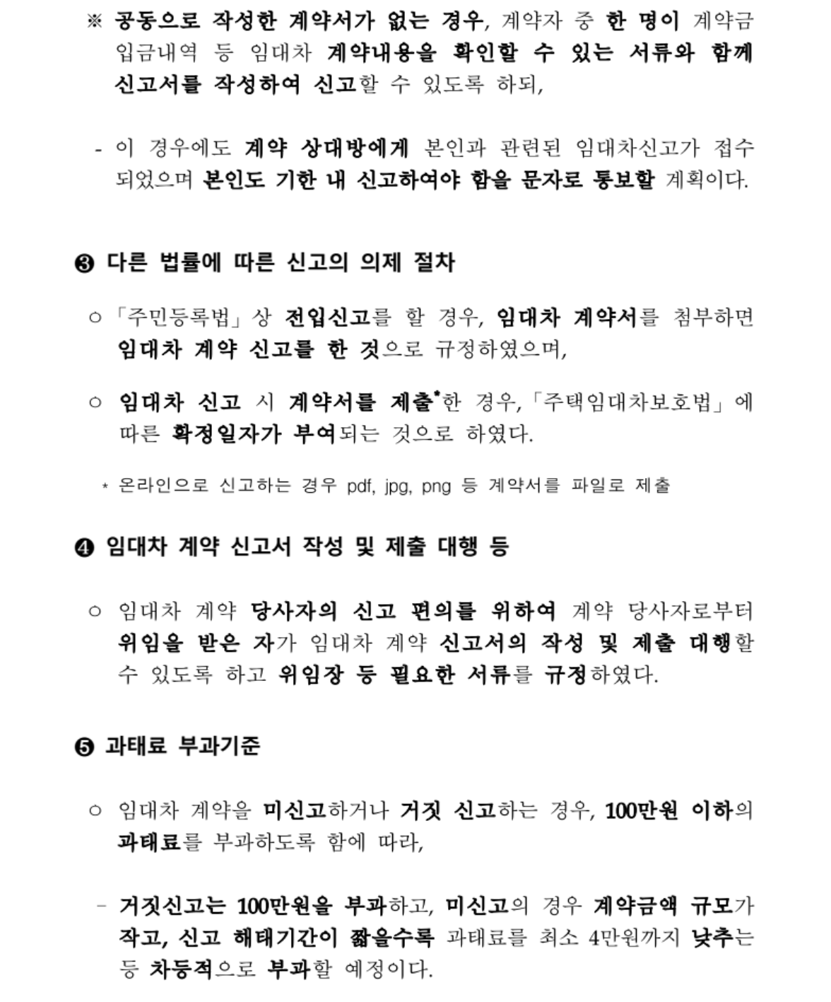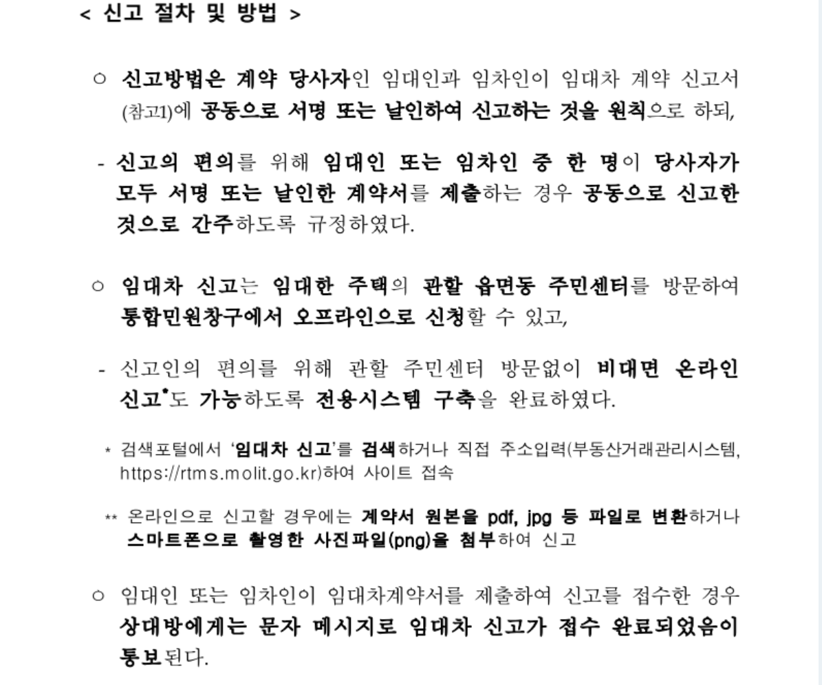 신고의 편의를 위해 집주인(임대인)과 세입자(임차인) 중 한 명이 당사자가 모두 서명 또는 날인한 계약서를 주민센터에 가서 신고하면 공동으로 신고한 것으로 간주합니다. 혹은 계약서를 사진찍어서 비대면 온라인 신고를 할 수 있도록 부동산거래관리시스템을 오픈하였습니다. 검색포털에서‘임대차신고’를 검색하거나 직접 주소입력(부동산거래관리시스템, https://rtms.molit.go.kr)하여 사이트에 접속해서 신고합니다.