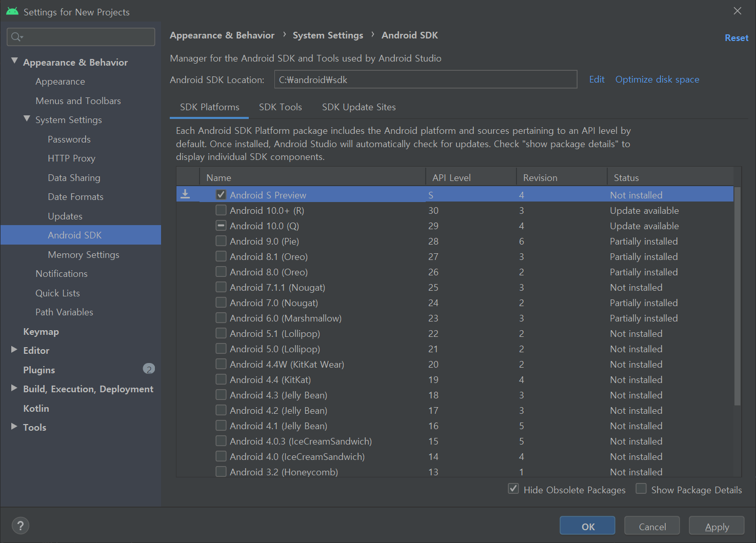 3. SDK Tools 탭에서 최신 버전의 Android Emulator를 선택하고 OK를 클릭합니다. 최신 버전이 아직 설치되어 있지 않다면 이 작업을 통해 설치됩니다. (Android S Preview를 선택하세요.)