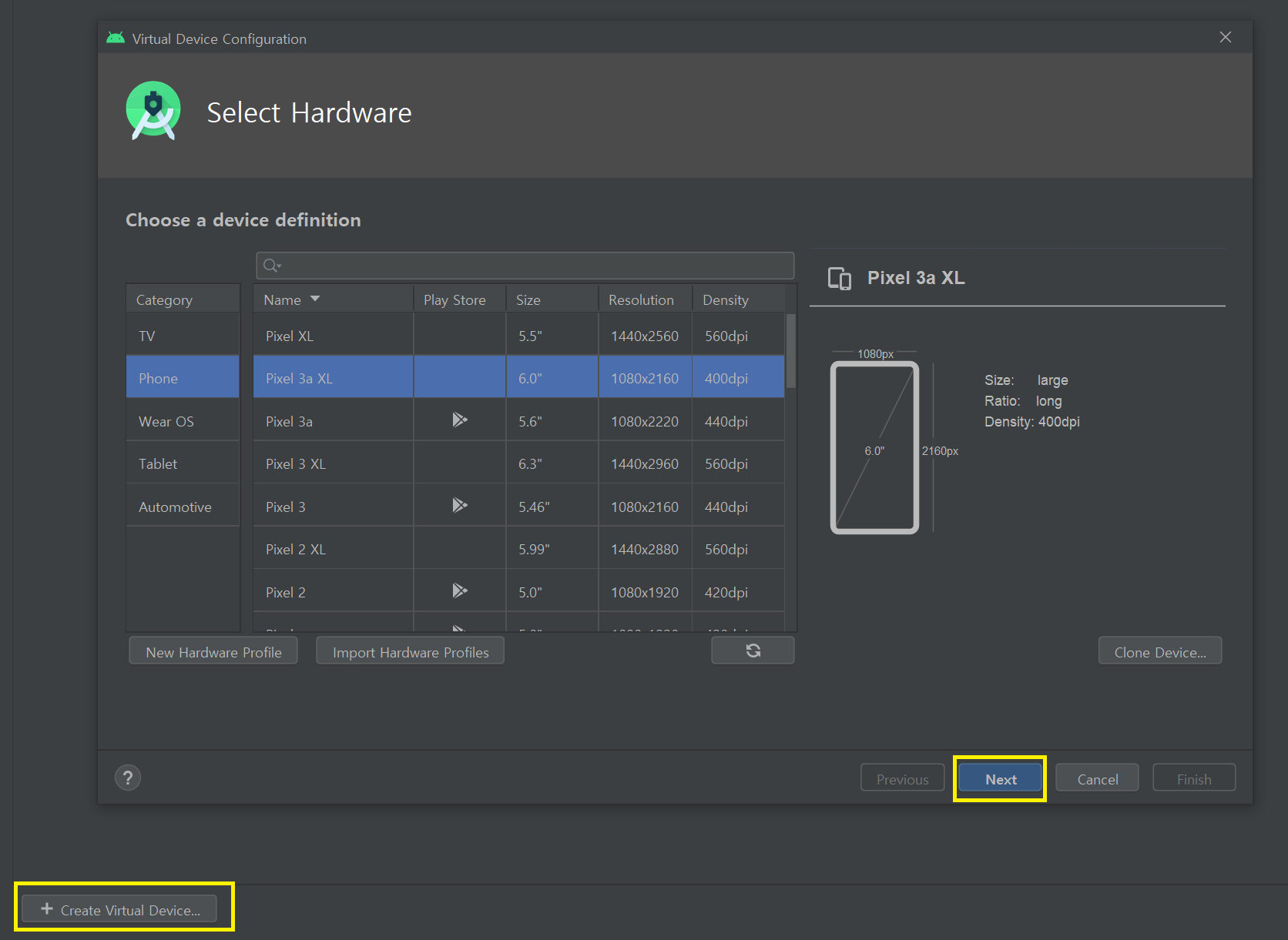 4. Android 스튜디오에서 Tools > AVD Manager를 클릭하고 안내에 따라 새 Android Virtual Device(AVD)를 만듭니다.