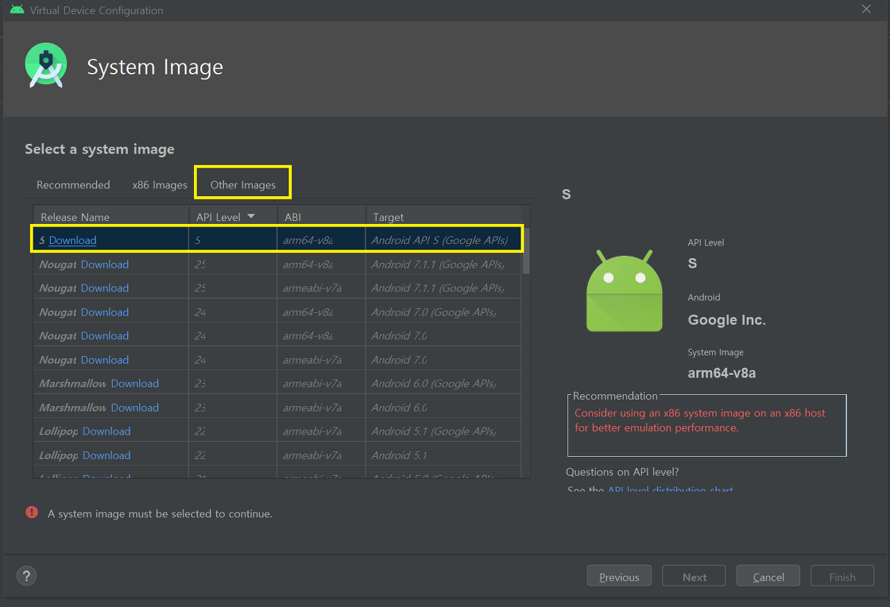 5. Pixel 3, 3a, 4, 4a 또는 5 기기 정의와 64비트 Android 12 에뮬레이터 시스템 이미지를 선택해야 합니다. 32비트 Android Emulator 시스템 이미지는 Android 12에서 지원되지 않습니다. 기기 정의와 일치하는 Android 12 시스템 이미지가 아직 설치되어 있지 않다면 버전 이름 옆의 Download를 클릭하여 다운로드합니다. 다운로드 받기 위해서는 1.3기가 바이트 공간이 필요합니다.