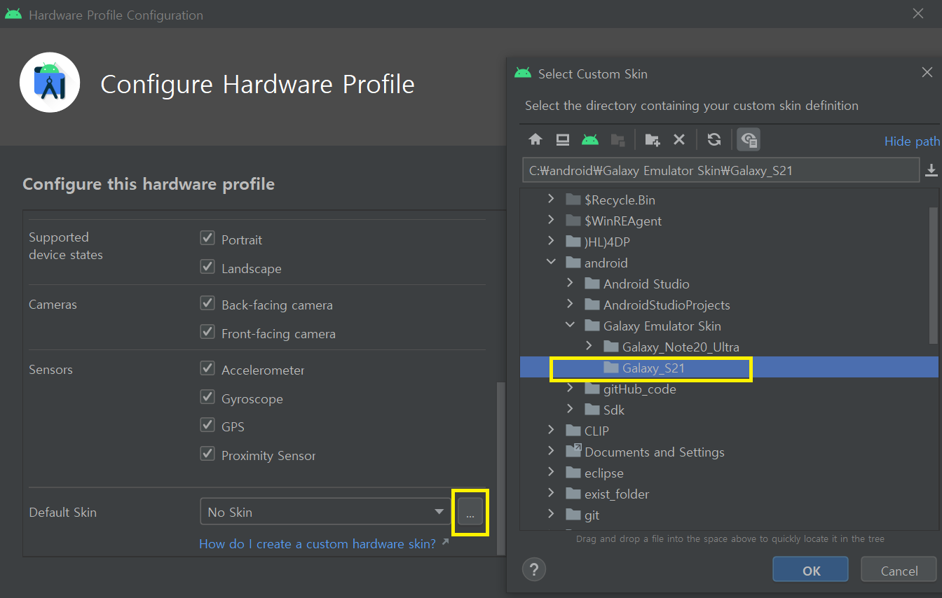 1. 다운로드한 파일의 압축을 해제합니다. 저는 C:androidGalaxy Emulator SkinGalaxy_S21에 압축을 풀었습니다.