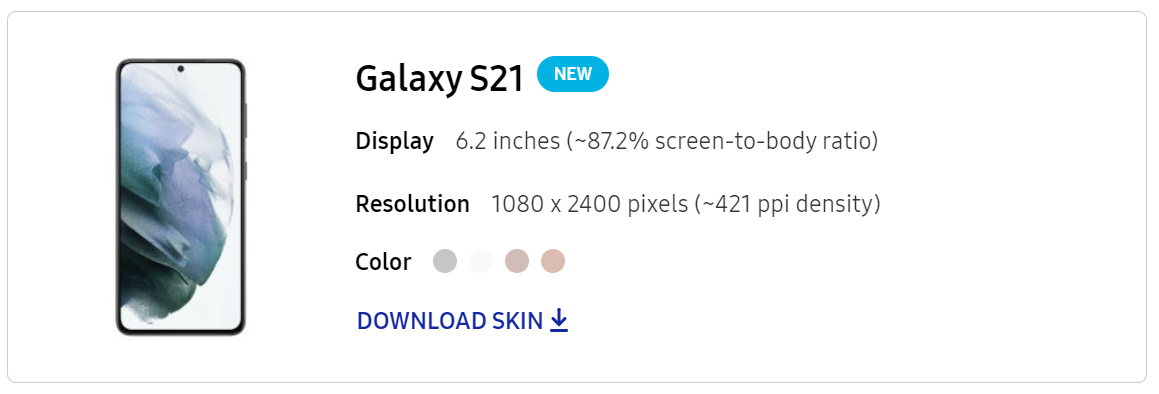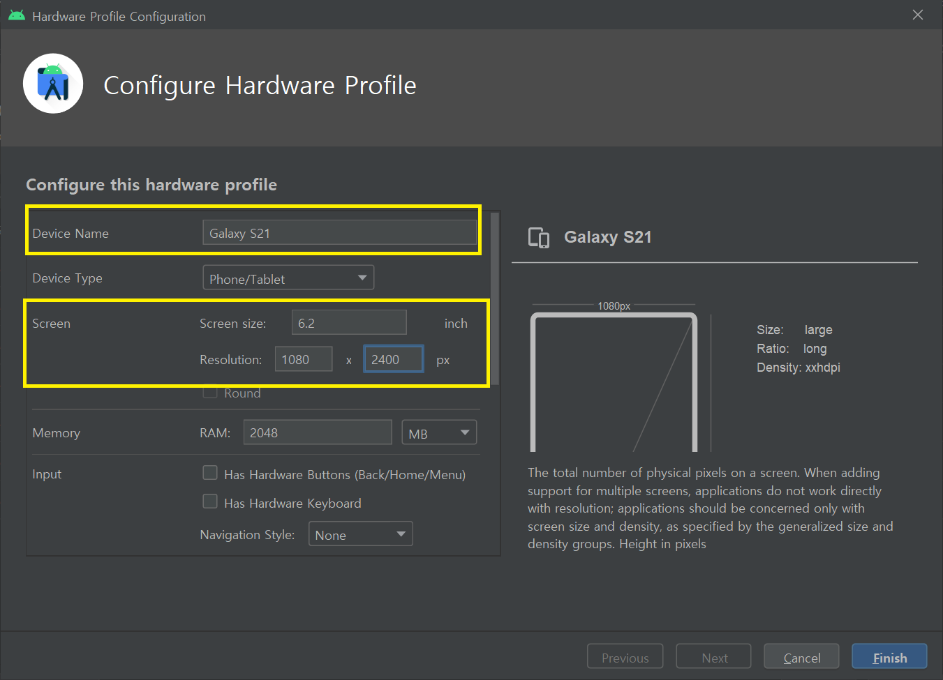 갤럭시S21의 디스플레이 사이즈와 해상도 정보는 나중에 수동으로 입력해야니 기록해두세요.