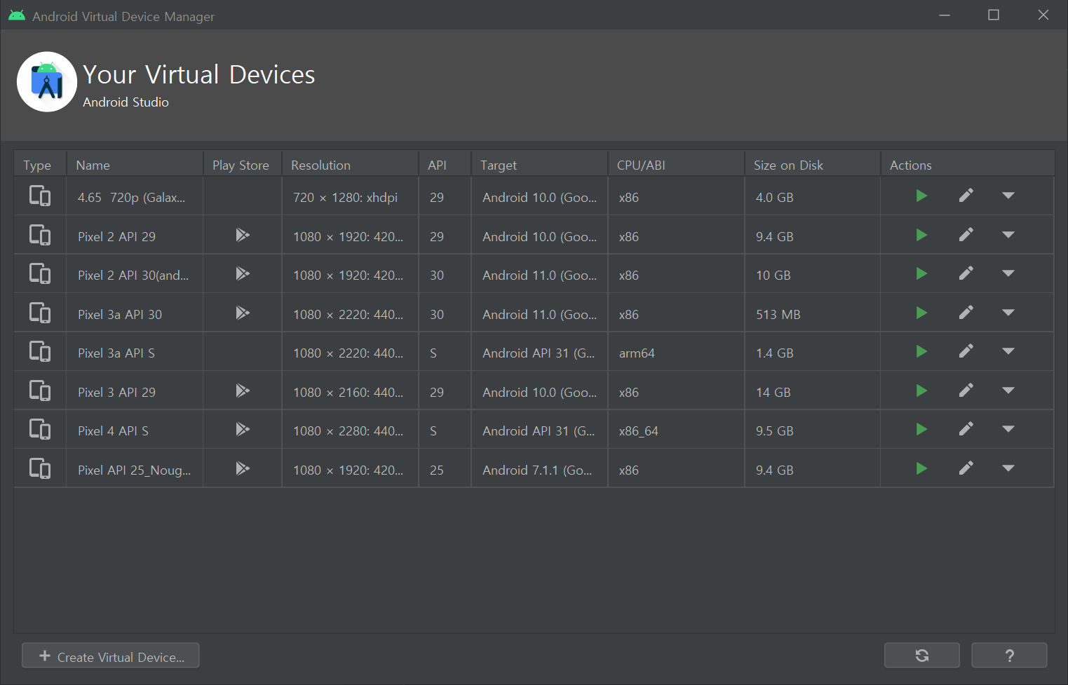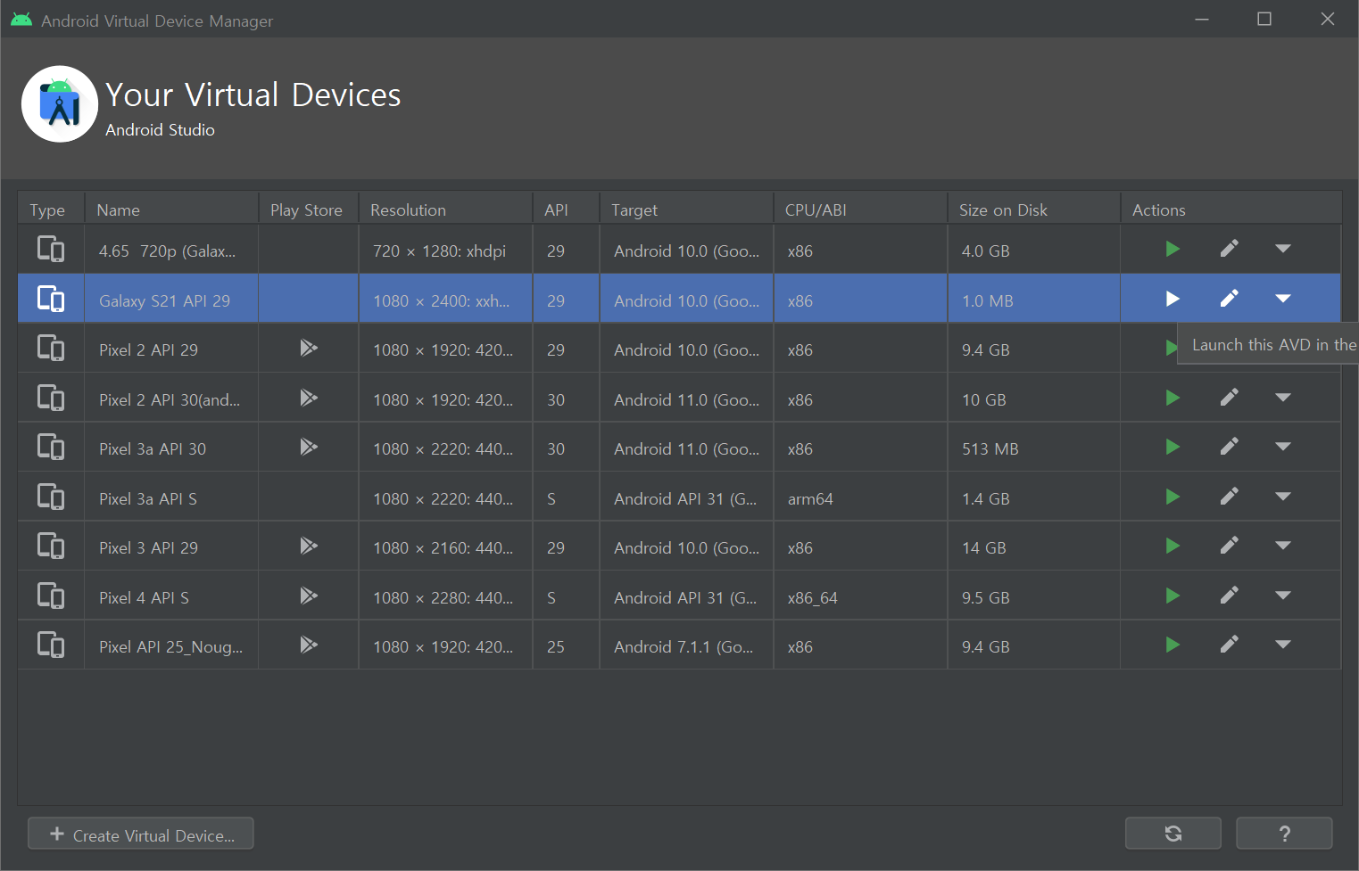 10. 추가한 갤럭시 S21 에뮬레이터를 Actions탭에서 재생 버튼을 클릭하여 실행합니다.