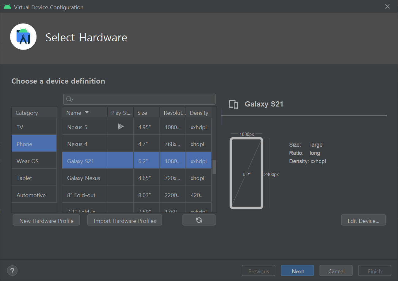 [Android Studio] 삼성 갤럭시 에뮬레이터 스킨을 AVD Manager를 사용하 추가하는 방법 :Emulator Skin을 변경하고 싶을 때 사용하세요.
