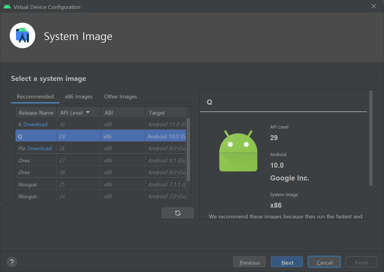 8. 테스트할 시스템 이미지(안드로이드 버전)을 선택 후 Next버튼 클릭