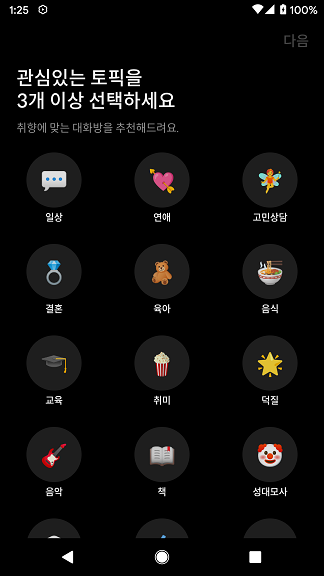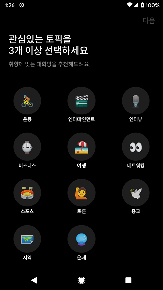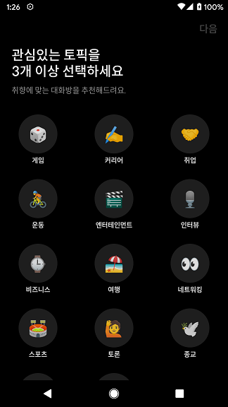 카카오판 클럽하우스 “음(mm)” 어플을 6월 6일 안드로이드 및 애플 IOS 양대 마켓에 출시되었습니다. 음은 클럽하우스 앱처럼 음성으로 실시간 대화를 나누는 소셜 서비스입니다. 26개의 주제 중에 3개 이상 선택하여 비슷한 관심사를 가진 사람과 얘기할 수 있습니다. 카카오톡 로그인 계정으로 로그인하여 이용할 수 있어요. 쌩판 모르는 사람들과 소통하는 것을 좋아하시는 분들에게는 신세계가 열린 느낌이네요. 카카오톡이 텍스트 소통방이라고 한다면 음(mm)은 사람들과 목소리로 얘기하는 수다방 같은 느낌??? 수다방을 비공개로 개설 후 친구들을 초대해서 대화를 나눌 수 있어서 잘 활용하면 워키토키(무전기)가 필요없는 세상??ㅎㅎ 친구들과 여러대의 차로 여행갈 때 비공개방을 열어서 대화할 수 있을 것 같네요.