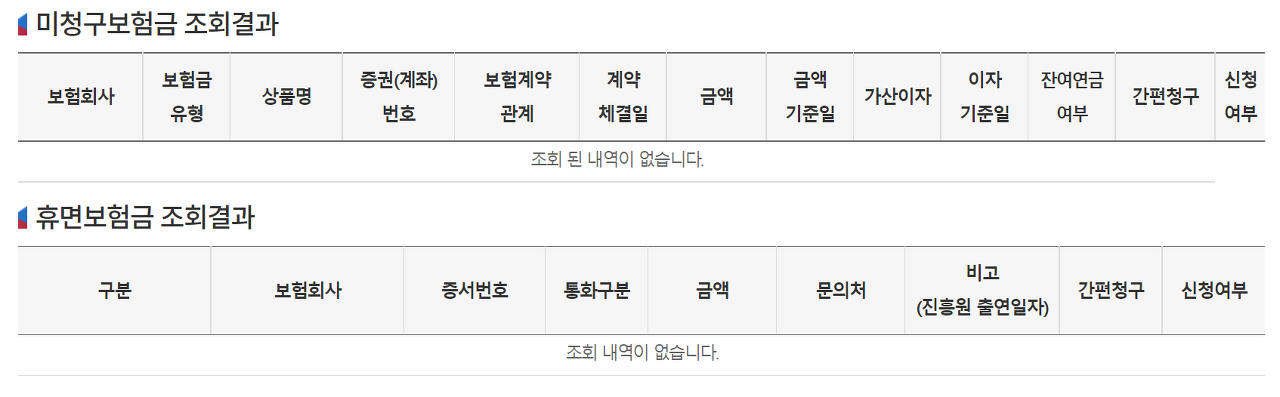 미청구보험금과 휴면보험금 조회결과를 확인할 수 있습니다.