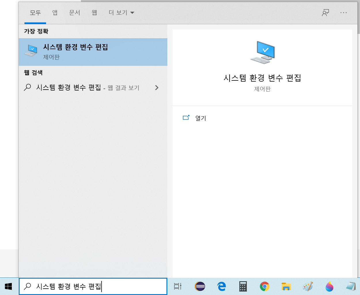 [스탭1] 윈도우 작업표시줄에서 검색필드에  "시스템 환경 변수 편집"을 검색하여 시스템 환경 변수 편집 창을 열어요. 검색 상단의 "가장 정확" 리스트에 "시스템 환경 변수 편집"을 클릭합니다.