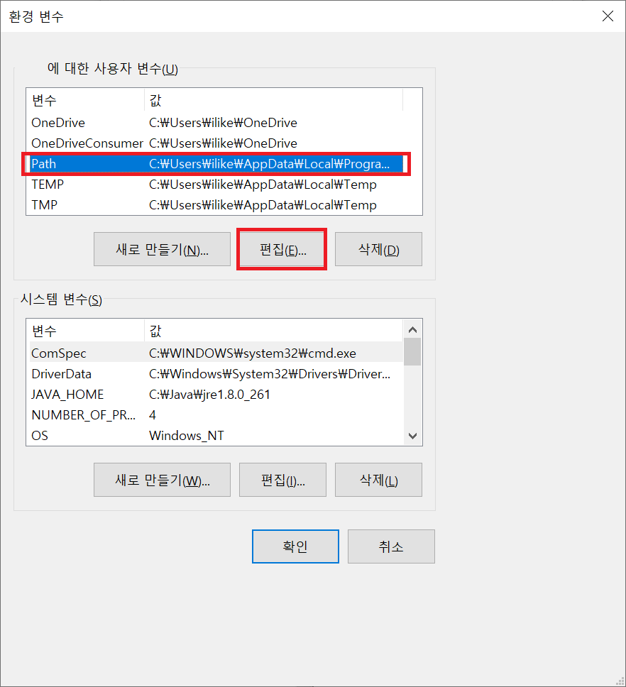 [스탭3] 환경변수 창이 열리면 "홍길동에 대한 사용자변수(U)" 영역에서 Path를 찾아서 선택한 다음 편집(E) 버튼을 클릭합니다.