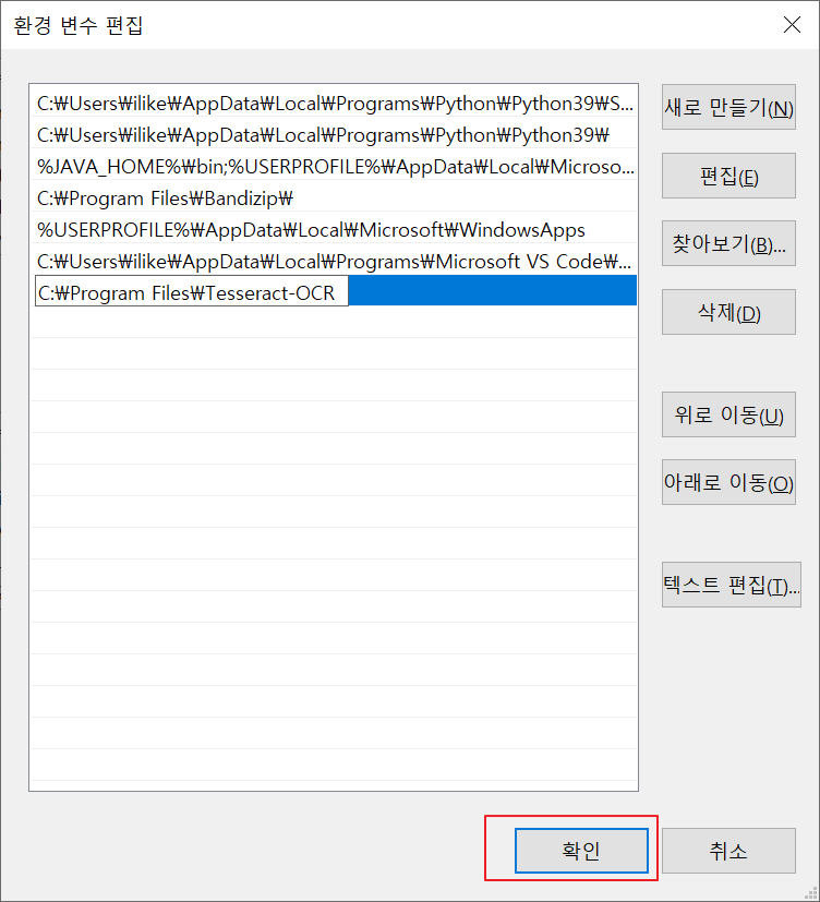 이렇게 환경변수에 등록하게 되면 어느 디렉토리에서든지 테서랙트 실행파일을 실행해도 오류가 발생되지않고 실행이 됩니다.