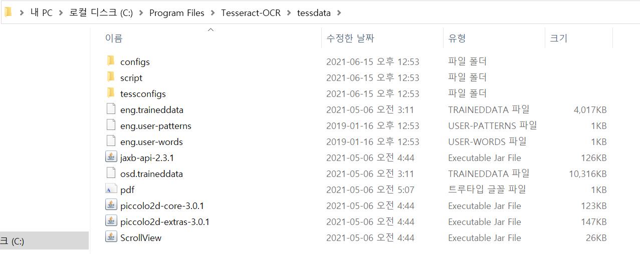 다운받은 파일은 테서랙트가 설치된 경로의 C:Program FilesTesseract-OCRtessdata 폴더에 복사해줍니다.