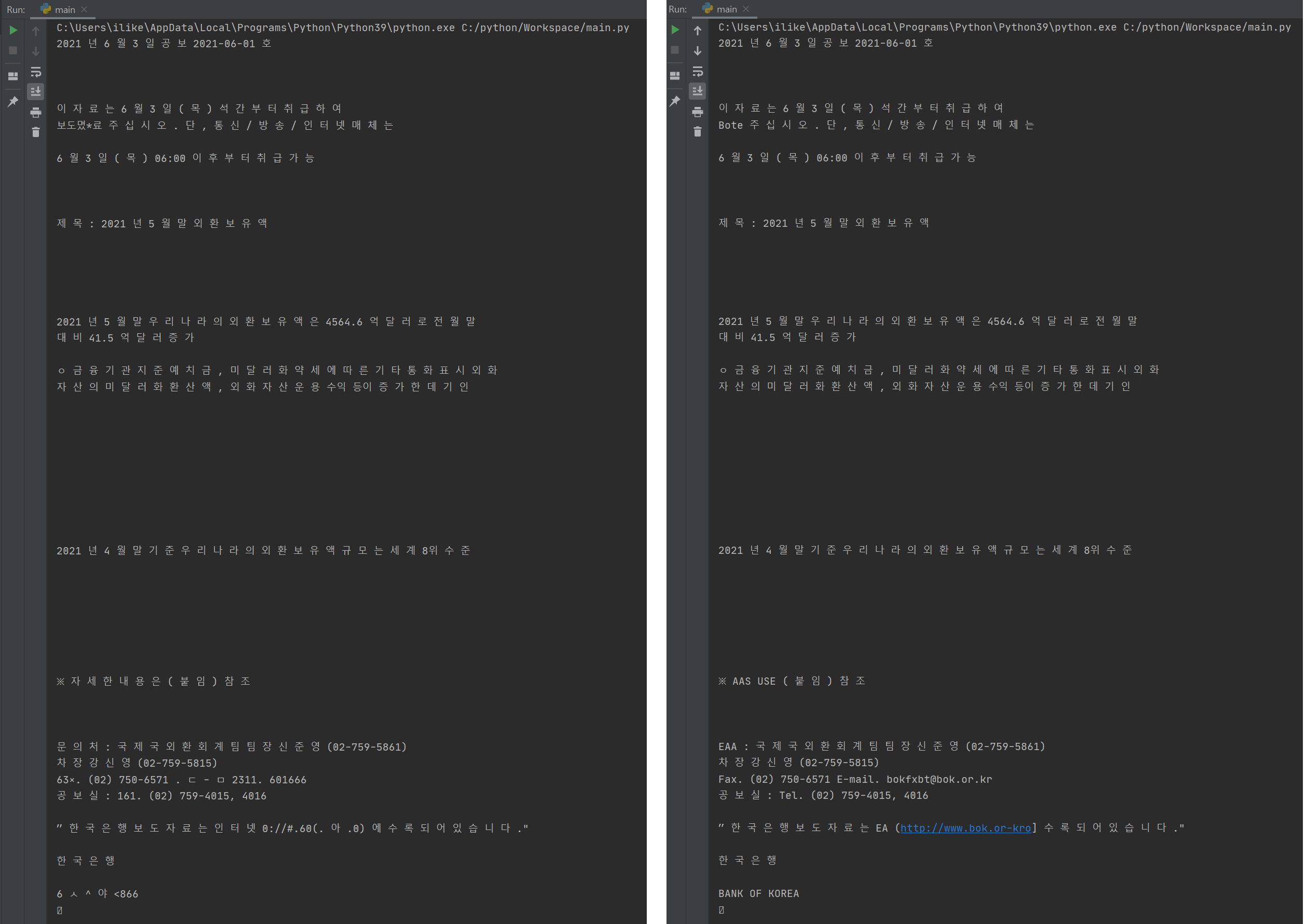 왼쪽은 한글만 오른쪽은 한글+영어의 결과 입니다.