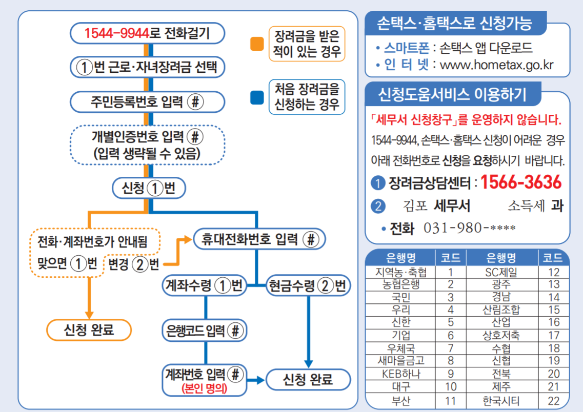 - 1544-9944전화 → 장려금 1번 → 주민등록번호 13자리# → 개별인증번호(8자리)*# → 동의하고 신청 1번 → 연락처 및 계좌번호 확인 → 신청종료
