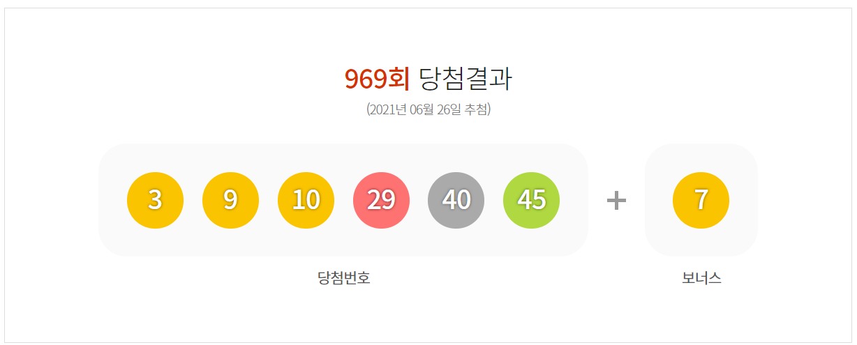 969회 당첨번호는 3,9,10,29,40,45 이며, 보너스 번호는 7입니다.