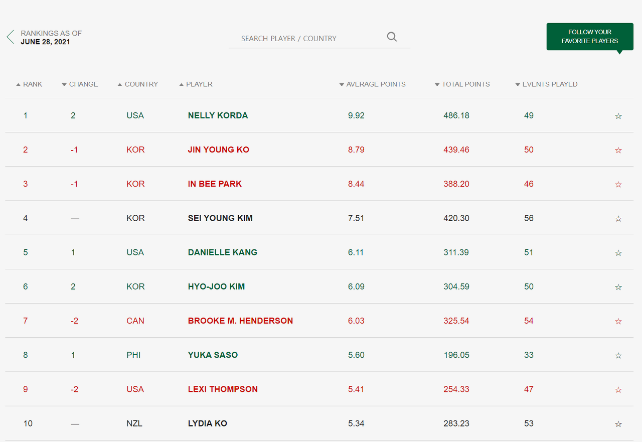 2021년 6월 기준 여자 골프 세계 랭킹 순위표입니다.