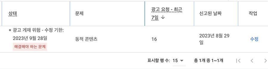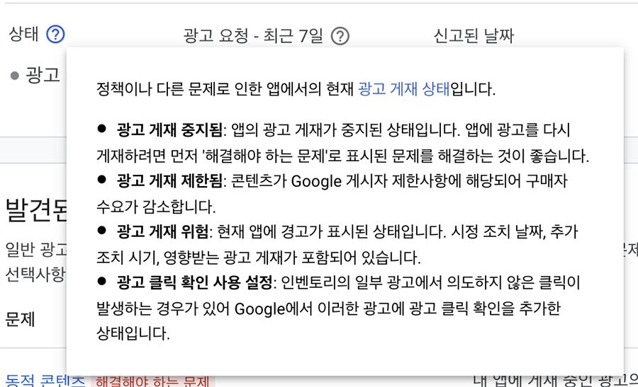 광고 게재 위험 위에 상태 옆에 물음표를 클릭해보니 다음과 같은 안내가 레이어팝업이 노출된다.
