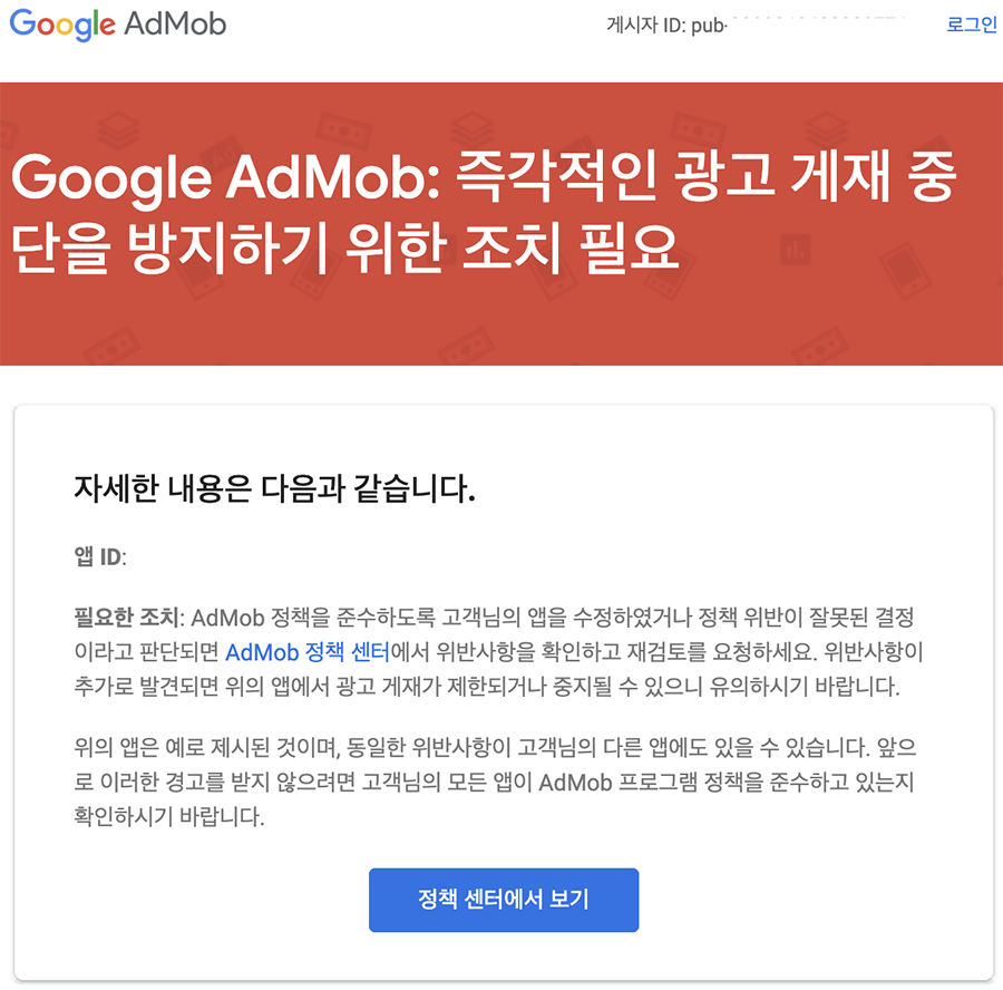 구글 애드몹 사이트에 로그인 후 정책 위반을 확인하였다.