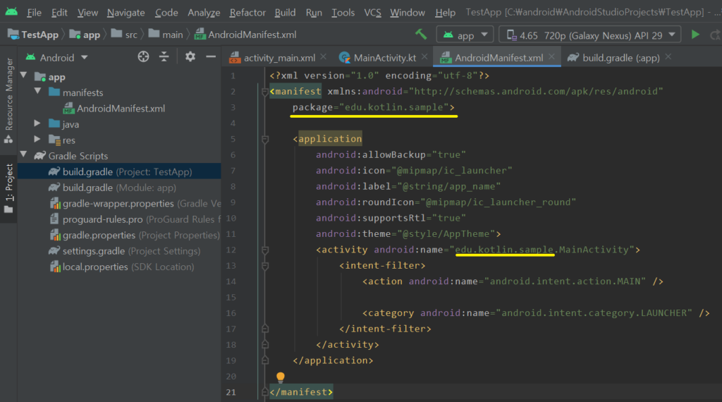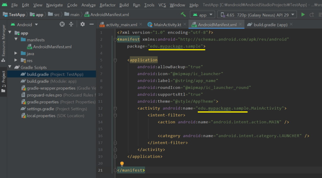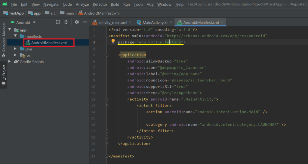 AdroidManifest.xml 파일을 열고, 패키지 명을 확인한다. 현재 예제에서의 패키지명은 edu.kotlin.testapp 이다. 변경하고 자하는 패키지명 위에 커서를 이동시킨다. testapp을 변경해보자.