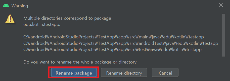 testpapp위에 커서를 위치하고 SHIFT + F6 키를 클릭하면 경고 팝업창이 나타난다. Rename package 버튼을 클릭한다.