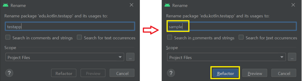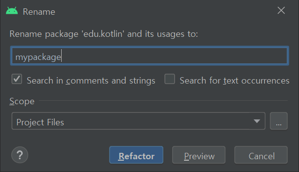 추가적으로 중간에 kotlin 패키지명을 다른 이름으로 변경하고 싶다면, kotlin위에 커서를 위치시키고 SHIFT + F6키를 클릭 후 변경을 진행한다. 이번에는 Search in comments and strings 체크 후 Refator 버튼을 클릭해보자