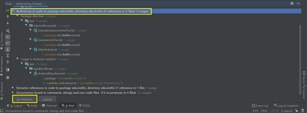 안드로이드 스튜디오 하단 Find 탭에 kotlin으로 사용중인 문자열을 모두 찾아준다. Do Refactor 버튼을 클릭하자.