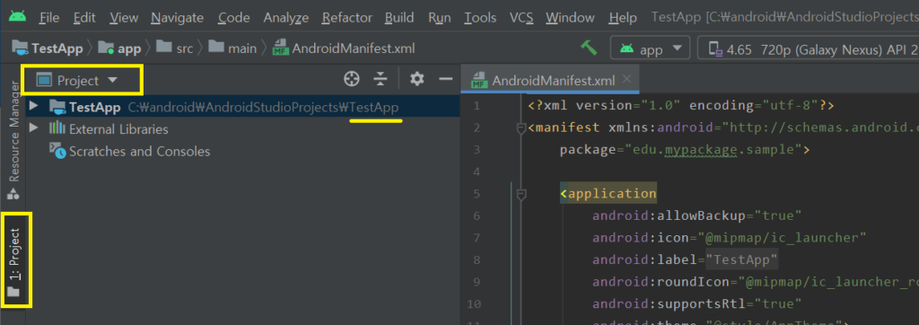 먼저 프로젝트 폴더명을 확인해보자. 왼쪽 Project탭에서 Android를 클릭후 Project로 변경한다. 프로젝트 폴더이름이 TestApp임을 확인할 수 있다.