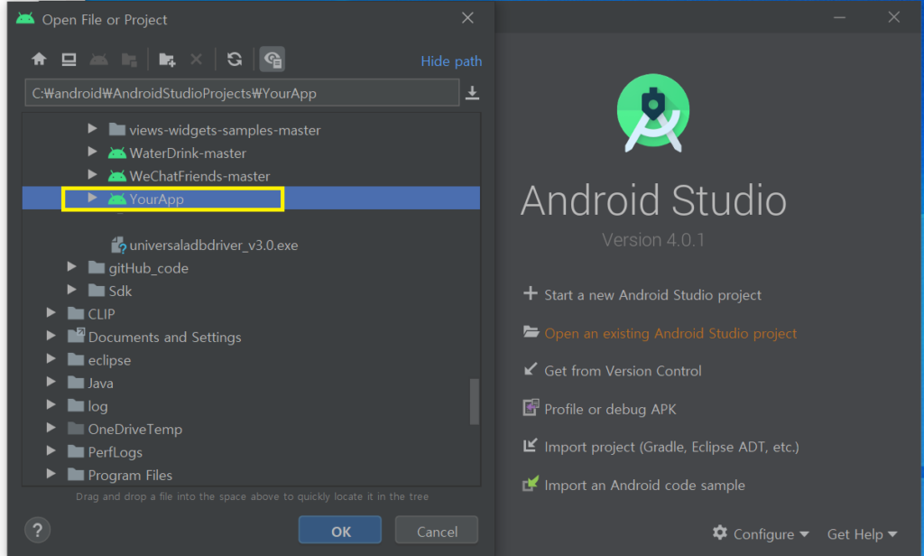 안드로이드 스튜디오를 다시 시작 후 변경된 프로젝트 폴더명을 찾아 선택 후 OK버튼을 클릭한다.