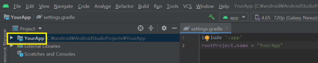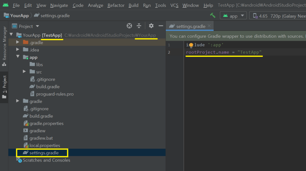 프로젝트 폴더명은 변경되었지만 여전히 testApp으로 보여지고 있다. settings.gradle파일을 열고 변경된 프로젝트 폴더명으로 변경해주어야 한다. settings.gralde(Project Settings)파일을 클릭한다.