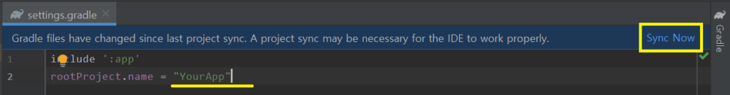 루트 프로젝트이름을 YourApp으로 변경 후 Sync Now를 클릭한다.